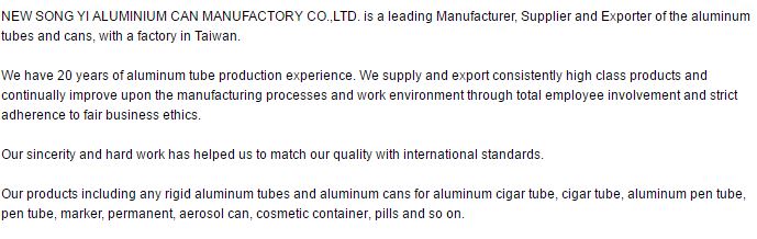 NEW SONG YI ALUMINIUM CAN MANUFACTORY CO.,LTD. هي واحدة من الشركات المصنعة الشهيرة والموردين والمصدرين من زجاجات المياه الألومنيوم ، مع مصنع في Taiwan. مع سنوات من الخبرة في خط القرارات ، ونحن معروفون لدينا الأداء المتميز في الصناعة. لقد ساعدنا انفسنا واحدة من العلامات التجارية الرائدة في Taiwan. نحن باستمرار رفع مستوى منتجاتنا لتلبية المعايير الدولية. ونحن نحمل فريق من المهنيين ، والتي تنص على التسليم جودة ت المحدد مع الإخلاص جودة.لنا العالية والعمل الجاد ساعدتنا المباراة الجودة مع المعايير الدولية.